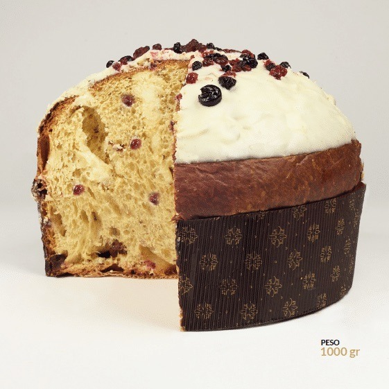 Panettone FRUTTI DI BOSCO E CIOCCOLATO BIANCO (un panettone molto soffice grazie al lievito madre, profumatissimo e molto goloso perché arricchito con morbidissimi frutti di bosco e dolcissime gocce di cioccolato bianco)
